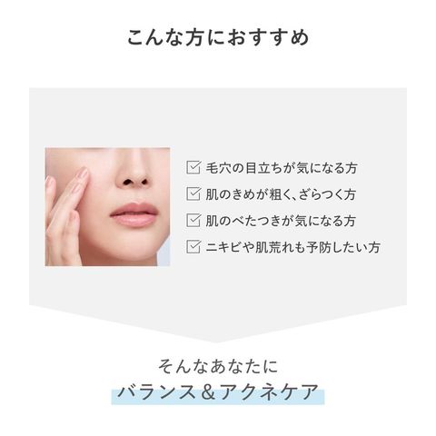 うるおいと皮脂のバランスを整え、うるおって毛穴が目立ちません。ニキビができやすいざらつきがちな肌にうるおいを与えきめを整えます。脂性肌~混合肌向けです。