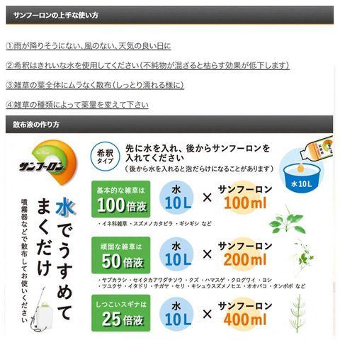 非選択性除草剤なので、作物にかからないようご注意下さい。展着剤は不要です。