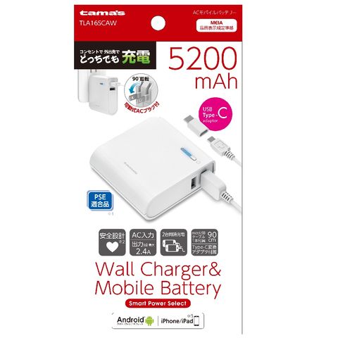 AC充電器一体型のモバイルバッテリー。5200mAh。