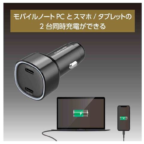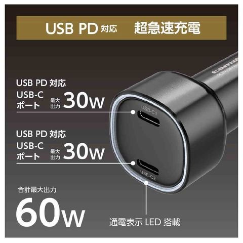 ●最大30WのUSB PD対応 USB-Cポートを2ポート搭載。2台同時にUSB PD充電が可能な車載充電器。