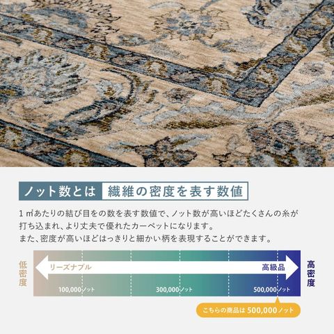 500,000ノットの高密度なパイルは、短めの毛足ながらもしっかりとした厚みを感じられ、踏み心地の良さや長く使える耐久性も魅力です。床暖房やホットカーペットとの併用も可能で、冬は暖かく夏も快適に。
