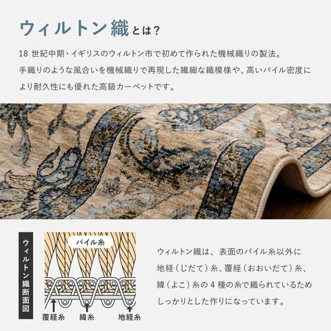 商品説明格式高い伝統柄と深みのある色合い、クラシカルなペルシャ調デザインをベースに、繊細な花柄モチーフを緻密に織り上たウィルトンラグ。