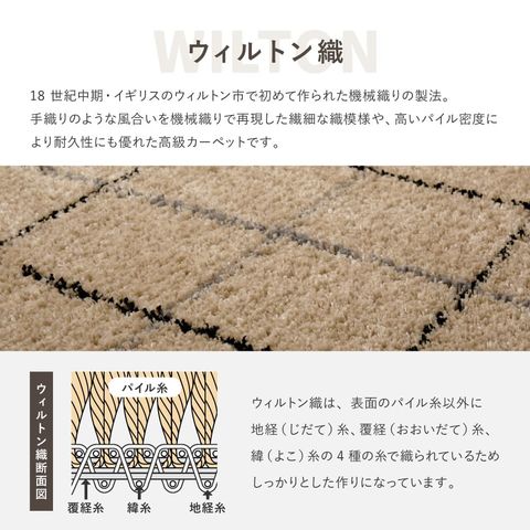 ヒートセット加工により、なめらかな触感と遊び毛の出にくさにも配慮。ホットカーペット・床暖房対応で、季節を問わず一年を通して使用できます。落ち着いたデザインはワンルームからリビングまで取り入れやすく、ソファ前やベッドサイドなど、日常のさまざまなシーンで活躍するウィルトンラグです。