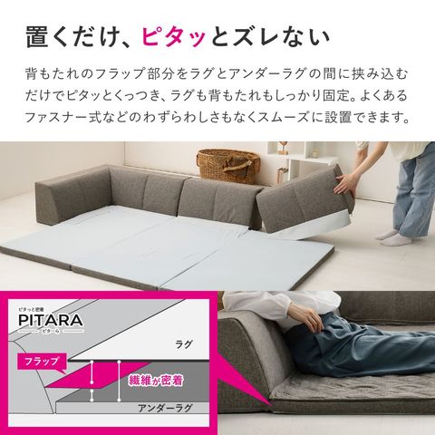 商品説明置くだけでピタッと密着!敷くだけでズレにくい特殊構造を採用した「ピターら」シリーズのラグソファ。ラグ・アンダーラグ・背もたれクッションを組み合わせて、背もたれの位置を自由にかえられるから、目的や人数にあわせて、様々なシーンへ対応できます。カバーは外して洗えるので清潔さをキープできるのも嬉しいポイント。さらりとした肌触りの生地で、オールシーズン快適にお使いいただけます。