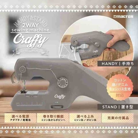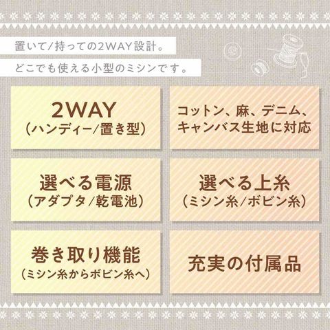 商品説明ハンディーまたは置き型で使える2WAY設計。どこでも持ち運べる小型のミシンです。