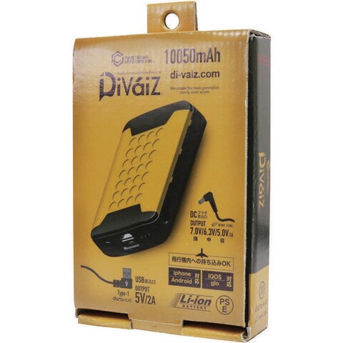 商品説明●電熱インナーシリーズに使用できるオプションです。●USB差込/DC差込口を同時搭載。●年中使えるマルチモバイルバッテリー。●夏のファンウェア、冬の電熱ウェアのほかモバイルバッテリーとしても使用可能です。●両バッテリー共にUSBケーブル充電器セットで充電可能です。●バッテリー、充電器ともにPSEマーク取得しています。●CUC(株)社製のEFウェア用のファンにも対応●品名:マルチモバイルバッテリー10050mAh●適合機種:電熱インナーシリーズ●バッテリー使用時間:最大約13時間●充電時間:約6時間●出力(V):7.0/6.3/5.0●定格容量(mAh):10050●サイズH(mm):103●サイズW(mm):71●サイズD(mm):24●充放電回数(回):約300 質量260g