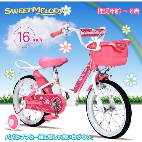 JIS耐振動試験合格品 フレーム/スチール リム/スチール(ホワイト塗装) 前輪ブレーキ/キャリパーブレーキ 後輪ブレーキ/バンドブレーキ ハンドル・バー/アップハンドル差込式 備考/カラーグリップ・カラーペダル・カラーベル・バスケット・フルカバーチェーンケース・ 前後マッドガード・カラード補助輪・リアキャリア・ハンドルバーパット・スポークデコレーション