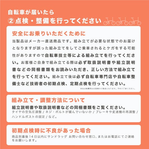 ※自転車は工場出荷時に点検・調整済みですが、輸送や組立ての際に調整に狂いが生じる場合がございます。そのため変速機やブレーキ、タイヤ空気圧など最終調整はお客様にてお願いいたします。