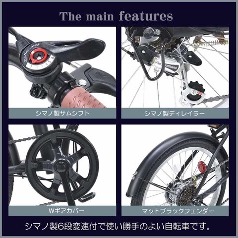 JIS耐振動試験合格品 フレーム/スチール リム/アルミ 前輪ブレーキ/キャリパーブレーキ 後輪ブレーキ/バンドブレーキ 変速シフター・ディレイラー/シマノ ハンドル・バー/セミフラットタイプ差込式 備考/折畳ジョイント部二重ロック方式・Wギアカバー・マットブラックフェンダー・ディレイラーガード 他