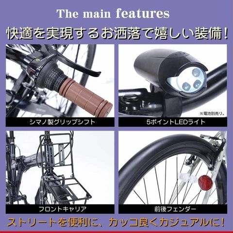 JIS耐振動試験合格品 フレーム/スチール リム/アルミ 前輪ブレーキ/Vブレーキ 後輪ブレーキ/Vブレーキ 変速シフター・ディレイラー/シマノ ハンドル・バー/セミフラットタイプ差込式 折畳部二重ロック LEDライト フロントキャリア 前後ドロヨケ チェーンガード 他