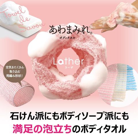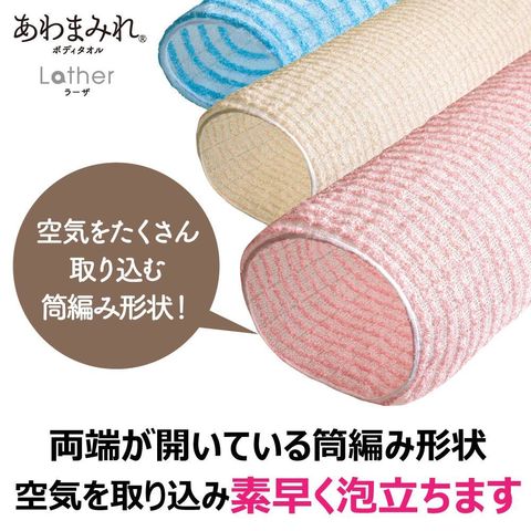 筒編み形状で空気を取り込みやすく、素早くたっぷり泡立つボディタオルです。