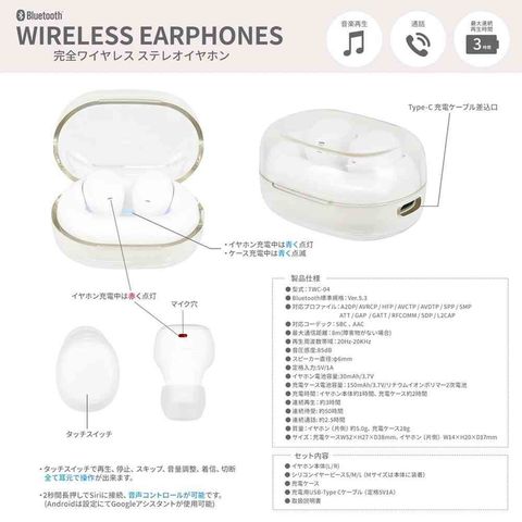 付属:シリコンイヤーピース(S/M/L)、ケース充電用USB-Type Cケーブル