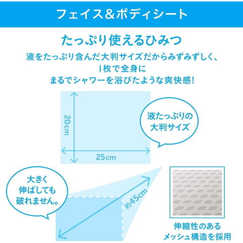 ●1枚で顔も身体も全身拭ける大判サイズのフェイス&ボディシートで大きく伸ばしても破れにくい。