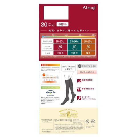 気温に合わせて選べる中厚手タイツ。ひざ下丈。蓄熱加工。毛玉ができにくく、肌ざわりなめらか。静電気防止加工。抗菌防臭加工。つま先すっきりヌードトウ。