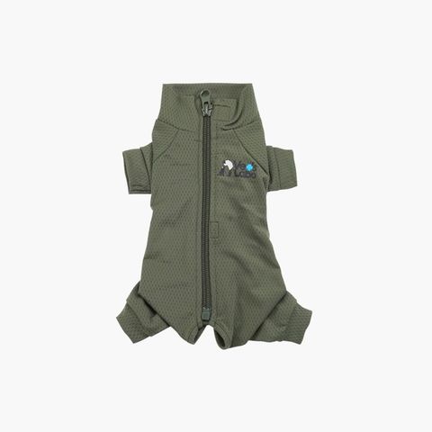 首からお尻まで全身を包み込み、デリケートな皮膚を守ってくれます。脇や鼠径部などの皮膚が薄くて傷つきやすい部分を保護できるだけでなく、お散歩中の草や虫との接触による皮膚トラブルを避けるのにも役立ちます。