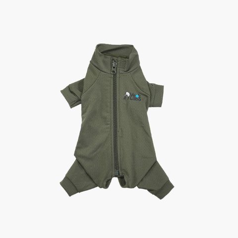 首からお尻まで全身を包み込み、デリケートな皮膚を守ってくれます。脇や鼠径部などの皮膚が薄くて傷つきやすい部分を保護できるだけでなく、お散歩中の草や虫との接触による皮膚トラブルを避けるのにも役立ちます。