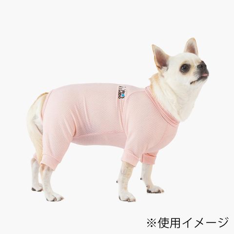 首からお尻まで全身を包み込み、デリケートな皮膚を守ってくれます。脇や鼠径部などの皮膚が薄くて傷つきやすい部分を保護できるだけでなく、お散歩中の草や虫との接触による皮膚トラブルを避けるのにも役立ちます。