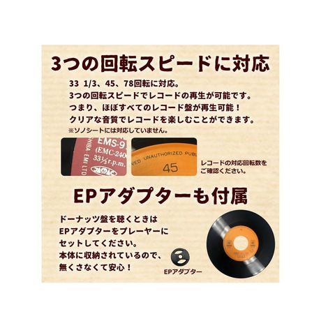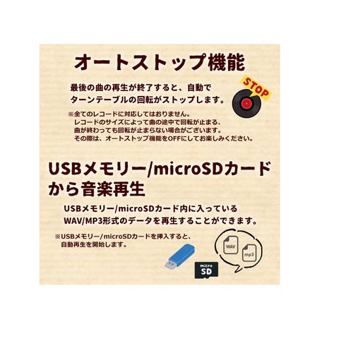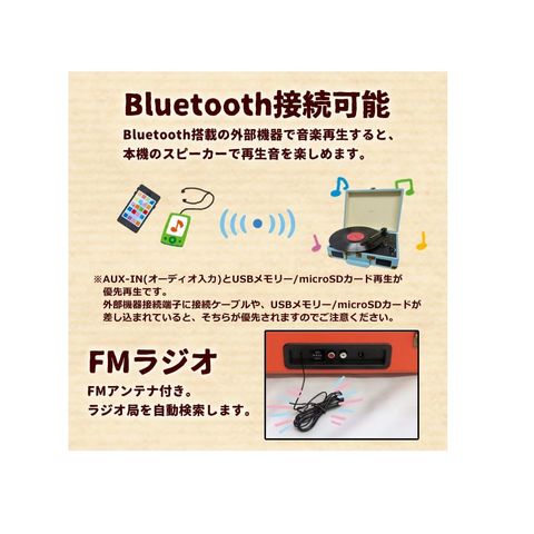 ●レトロな外観でも、機能は充実。気軽に聴けるのでレコードデビューにピッタリ!●レトロなトランクケース型で部屋の隅に置いても、オシャレな雰囲気に。●使わない時はフタを閉めておけば、埃も入りません。●持ち運び簡単。部屋の移動もらくらく●331/3、45、78回転に対応。クリアな音質でレコードを楽しむことができます。●EPアダプターも付属●最後の曲が終了すると自動でターンテーブルの回転がストップする、オートストップ機能搭載●USBメモリー/microSDカードから再生/録音可能●Bluetooth接続可能●FMアンテナ付き