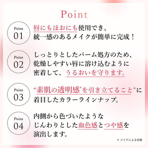頬にも使いやすい自然な発色で、じんわり血色感とツヤ感アップ。