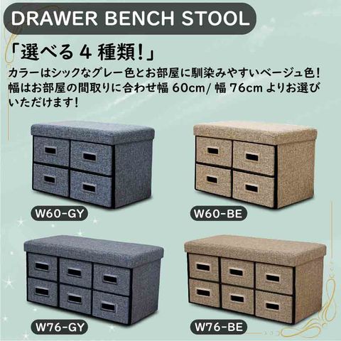 商品説明●耐荷重80kgクリアした大容量の収納+踏み台+ベンチとしてもご利用可能な一石三鳥の便利なアイテム。●組立金具が一切ない楽組仕様で女性の方でも楽々組立可能。●幅60cmのベンチスツールは4杯引出しで大容量の収納可能。