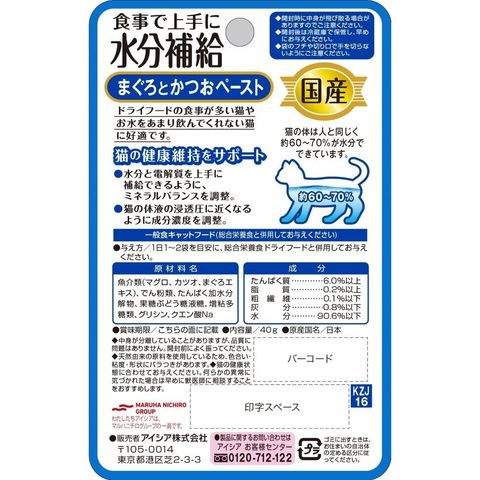 水分と電解質を上手に補給できるように、ミネラルバランスを調整。さらに猫の体液の浸透圧に近くなるように成分濃度を調整し、猫の健康維持をサポート。ドライフードの食事が多い猫や、お水をあまり飲んでくれない猫に好適。ペーストタイプ。