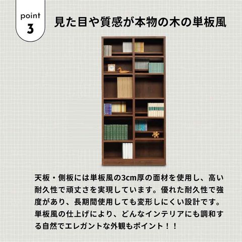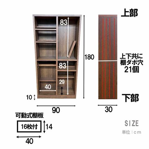 商品説明●すぐに使える完成品で組立不要。●天面、側板面材には単板風の3mm厚の面材使用で高級感があり。●家具の産地【大川市】にて生産。●前後2枚の可動式棚板を同じ高さに設置することによって、奥行が29cmとなり、雑誌やA4サイズの本も収納可能。●可動棚は、16枚付きで自由自在に収納可能。●可動棚耐荷重:10kg。●カラー:ブラウン色。●生産国:日本。