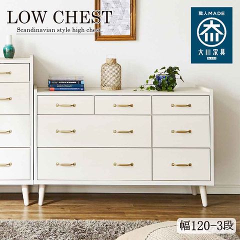 商品説明●北欧風のオシャレな幅120cmのローチェスト。●家具の産地【大川市】にて生産。●引出し(大)はレール付きで開閉も楽々。●脚付きなのでお掃除も楽々。●脚高:14cm。●引出し(大)内寸:幅71×奥33.5×高14cm。●引出し(中)内寸:幅34×奥33.5×高14cm。●引出し(小)内寸:幅34×奥33.5×高10cm。●カラー:ホワイト色。●生産国:日本。