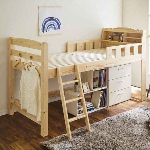 商品説明●材料は、建築資材などに使われるフィンランドパイン材を採用。●ヘットボード部分は照明・充電に便利な2口コンセント付き。●ベッド下の空間も有効活用可能でお子様の秘密基地としてもご利用可能。●カラー:ナチュラル色。●生産国:中国。