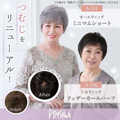 商品説明プリシラ ミセス六分ウィッグ フェザーカールハーフ 耐熱 ダークグレイヘア A-116-TDGH
