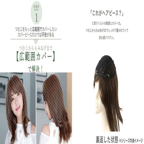 クリップで固定するタイプのウィッグです。「ヘアピース以上フルウィッグ未満」のアイテム「五分ウィッグ」が登場!クリップでパチンと留めるだけで頭頂部全体をしっかりカバーします。つむじや分け目だけをカバーするヘアピースじゃなんとなく不安…、全頭タイプのかつらをかぶるのも抵抗がある…、そんな方におすすめなのが『五分ウィッグ』です。つむじからもみあげにかけて広範囲をカバーしてくれるので、風が吹いても大丈夫!(※フルウィッグではありません。)
