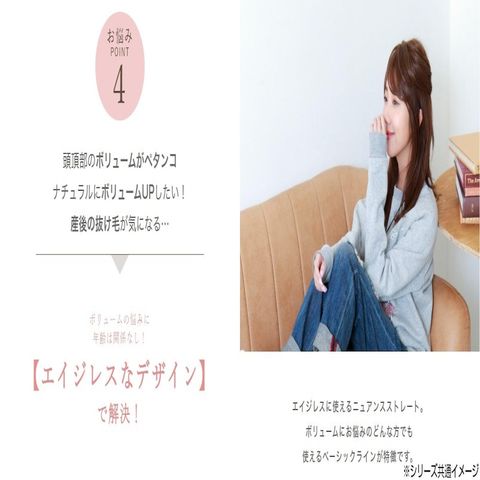自毛をいかし、頭頂部全体をカバーするストレートタイプ 見た目も自然で安心感抜群です。とっても使いやすいニュアンスストレートタイプは、エイジレスで使えるベーシックなデザインです。