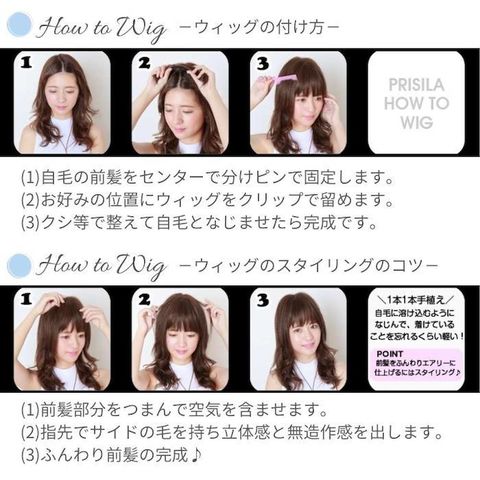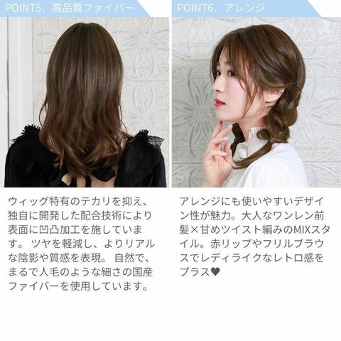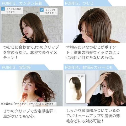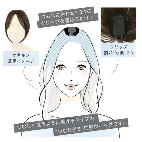 素材・材質:耐熱ファイバー100% 仕様:ウィッグのタイプ(マシンメイド前髪ウィッグ(つむじ有り)、自毛の前髪を両サイドに分けた上に着けるタイプの部分ウィッグ※前髪の生際部分のうぶ毛のみ手植え)、人工スキン有、クリップ3個付き(前側:1個、後側:2個)
