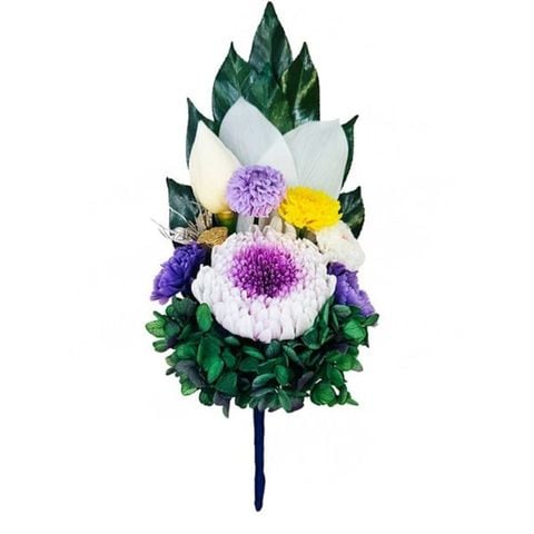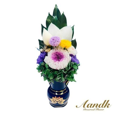 商品説明生花由来の仏花のプリザーブドフラワーです。椿葉、輪菊、小菊、ハスの蕾、アジサイなどを使用。造花は使用せず花材はすべて天然素材を使用しているため、仏様にためらうことなくお供えでき安心して飾ることができます。水やり・交換不要でとっても経済的。※花器は付属しておりません。特殊加工することで長期間水やり不要で飾れます。目安として約1年程度お使いいただけます。(使用環境による)造花に抵抗があっても、この商品は生花なので安心してお供えできます。ひとつひとつ丁寧に手作りで作っております。機械的ではないので、生花と同じように少しづつ違いがあります。お手入れの際には柔らかい乾いた布などでホコリを落とす程度にしてください。