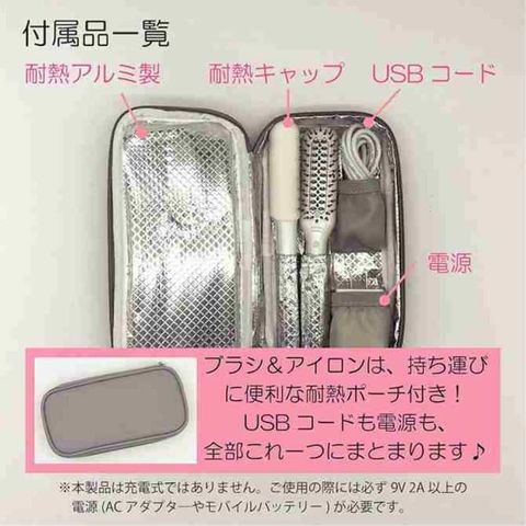 商品説明業界初のUSBで使えるブラシアイロンと、業界最強のハイパワーUSBヘアアイロンのセットです。電源アダプター、USBコード、アイロン用耐熱キャップ、耐熱ポーチ付きで、買ったらすぐに使えます。※本製品は充電式ではございません。ご使用の際には必ず9V 2A以上の電源(ACアダプタ―やモバイルバッテリー)につないでお使いください。洗練されたパッケージデザインで、プレゼントにもぴったり!グリスターブラシは、ダイレクトマイナスイオン搭載。とかすだけで誰でもカンタンにナチュラルストレート&ふんわりカールが作れます。グリスターアイロンは、カールもストレートもできる2Way仕様。セラミックコーティングプレートで、髪を傷めないなめらかな使いごこちです。ブラシとアイロン、どちらも140C/180Cの2段階温度設定。30分経過で自動で電源がOFFになるので、電源を切り忘れても安心。