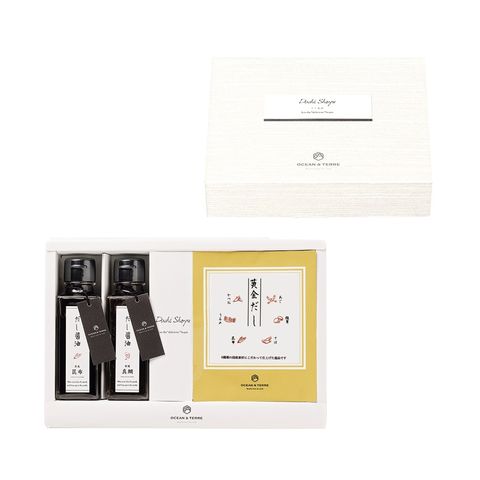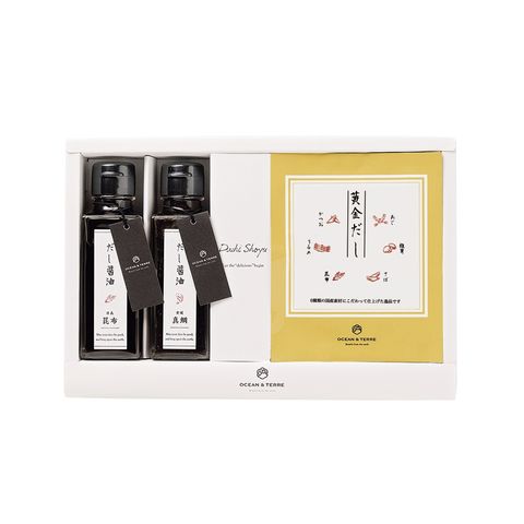【北海道日高昆布醤油】しょうゆ(本醸造)(国内製造)、昆布エキス、清酒、砂糖、かつお節エキス、オリゴ糖、食塩、酵母エキス、たん白加水分解物/調味料(アミノ酸等)、増粘剤(キサンタン)、酒精、(一部に小麦・大豆を含む)【愛媛県真鯛醤油】しょうゆ(本醸造)(国内製造)、アミノ酸液、醸造調味料、砂糖、鯛エキス、かつお節エキス、食塩、昆布エキス、酵母エキス、たん白加水分解物、醸造酢/調味料(アミノ酸等)、酒精、酸味料、(一部に小麦・大豆を含む)【黄金だしパック】風味原料(かつお粉末(国内製造)、いわし粉末、さば粉末、あご(とびうお)粉末、椎茸粉末、昆布粉末)、ぶどう糖、食塩、粉末しょうゆ/調味料(アミノ酸等)、(一部に小麦・さば・大豆を含む)