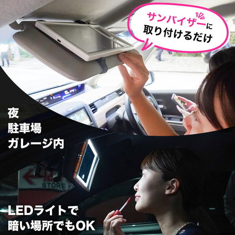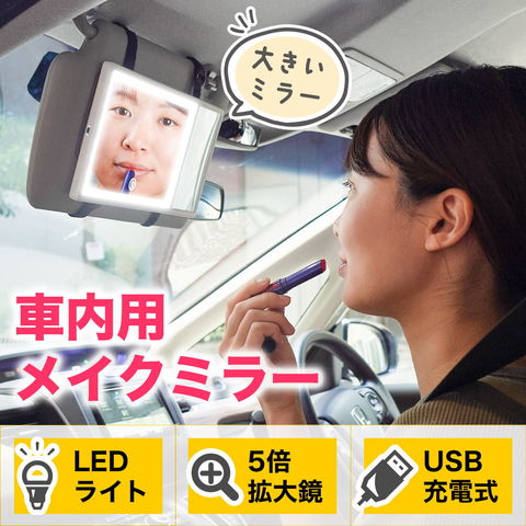 商品説明LEDライト付きで車内での化粧直しが快適に。拡大鏡もついたサンバイザーに取り付けるメイクミラー