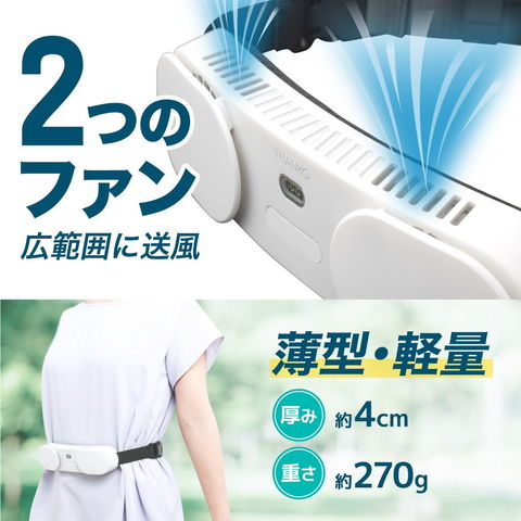 商品説明2つのファンで広範囲に風が吹く、ハンズフリーで使えるベルト型扇風機