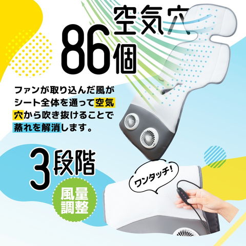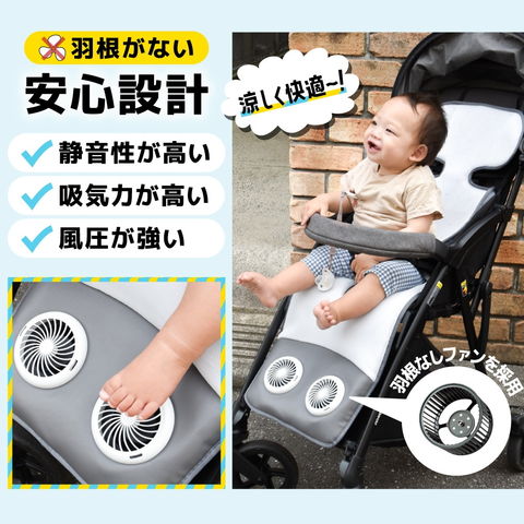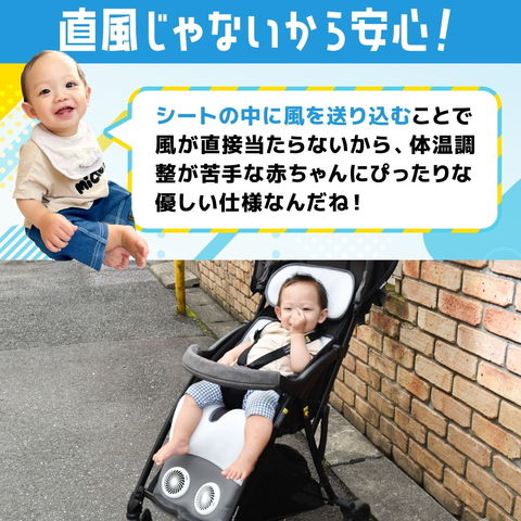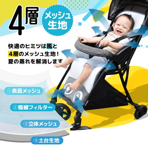 Wファンとメッシュ生地で汗ばみやすい赤ちゃんの蒸れをスッキリ解消してくれます。
