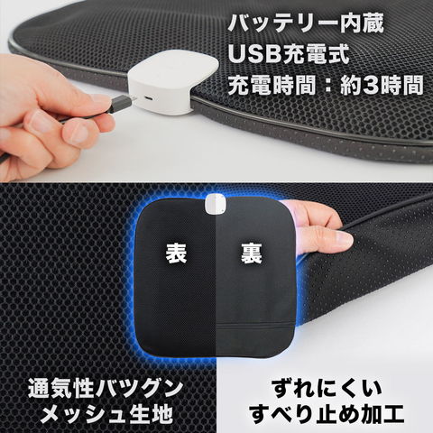 充電式のクッションの中を風が通り、座っていても風がスーッと爽快に!
