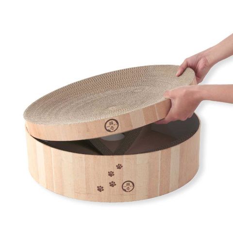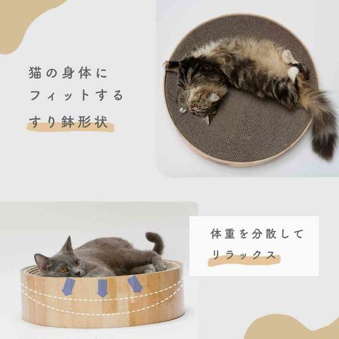 つめとぎ兼ベッド部分はダンボール製。重なりあった薄いダンボールが、土台に沿ってきれいなすり鉢状を作ります。猫のやわらかいからだにフィットするので、猫がリラックスできます。