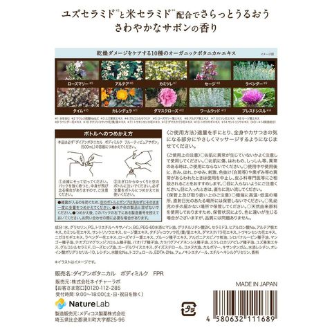 <ご使用上の注意> ●お肌に異常が生じていないかよく注意して使用してください。 ●お肌に傷、はれもの、しっしん等、異常のある時は、ご使用にならないでください。●使用中や使用後に、赤み、はれ、かゆみ、刺激、色抜け(白斑等)や黒ずみ等の異常があらわれたときは使用を中止し、皮ふ科専門医等にご相談されることをおすすめします。●目に入らないようにご注意ください。目に入ったときは、直ちに洗い流してください。<保管上及び取り扱い上のご注意> ●極端に高温・低温の場所、直射日光のあたる場所には保管しないでください。●乳幼児の手の届かない場所で保管してください。●天然由来原料を使用しておりますため、保管状況により、色に違いが生じる場合がございますが、品質には問題ありません。