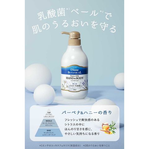 ●うるおい乳酸菌と黒はちみつ配合。90%以上天然由来成分配合のハンド&ボディミルク。