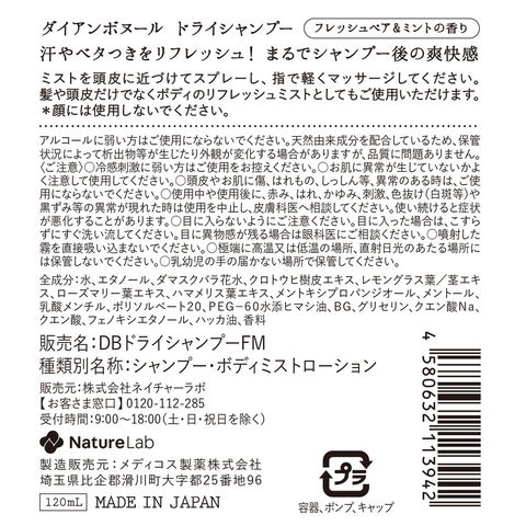 汗やベタつきをリフレッシュ。 98%以上天然由来成分(水を含む)のドライシャンプー。 フレッシュペア&ミントの香り。 ●ミストを頭に近づけてスプレーし、指で軽くマッサージしてください。 ●髪や頭皮だけでなく、ボディのリフレッシュミストとしてもご使用頂けます(顔には使用しないでください) ※パッケージデザイン等は予告なく変更されることがあります。
