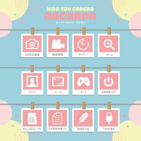 ボタンを押すだけの簡単操作で、お子さまでも手軽に写真や動画撮影が楽しめるキッズカメラです。1200万画素の高画質撮影に対応し、動画撮影や自撮りモード、かわいいフレーム機能など、遊びながら思い出を残せます。タイマー機能やズーム機能も搭載し、シーンに合わせた撮影が可能。さらにゲーム機能付きで、カメラとしてだけでなく遊び道具としても活躍します。約72gと軽量で持ち運びやすく、自動電源OFF機能で電池の消耗を防止。充電はマイクロUSB Type-B対応で約2時間で満充電できます。付属品は取扱説明書、ストラップ、充電ケーブル、8GBのmicroSDカード、日本語説明書付きで、届いてすぐに使えるセット内容です。