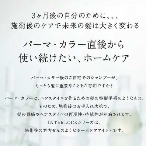また、パーマ・カラー直後の集中ケアに最適でパーマのダレやカラーの褪色を防ぎ、ヘアスタイルの「賞美期限」を高めます。