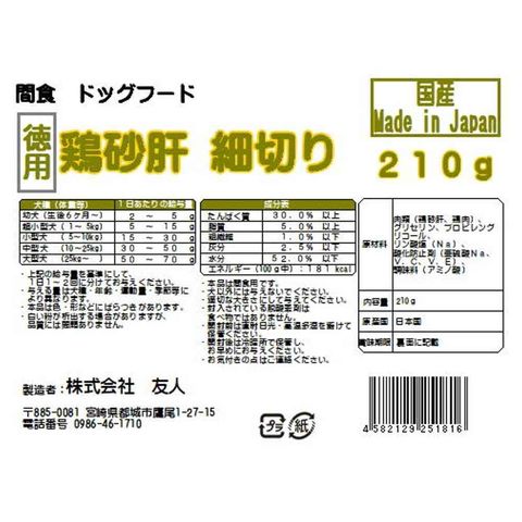 肉類(鶏砂肝、鶏肉)、グリセリン、プロピレングリコール、リン酸塩(Na)、酸化防止剤(亜硫酸Na、V.C.、V.E.)、調味料(アミノ酸)