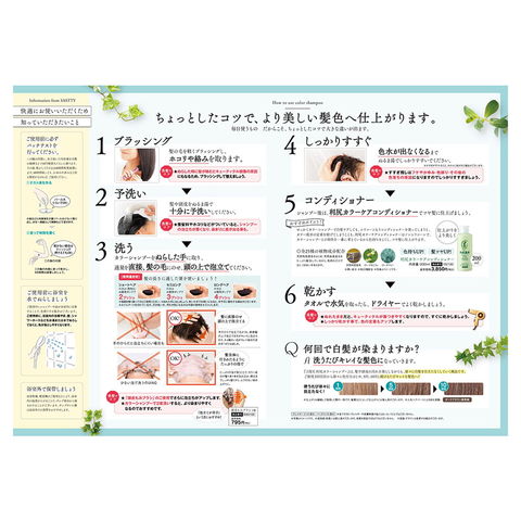 ・万一目に入った場合は、すぐに洗い流して下さい。 ・極端に高温又は低温の場所、直射日光のあたる場所には保管しないで下さい。 ・バスタブ、洗面所等に色素が付着した際は、とれにくい場合がございますのでご注意下さい。 ・汗や雨、ご使用後に育毛剤を使用する時は、色落ちする場合がございます。 ・すすぎが不十分な場合、寝具等に色移りすることがございますので、しっかりとすすいで下さい。