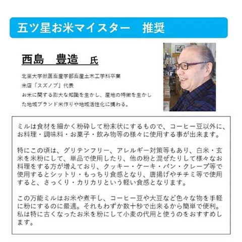 商品説明・煮干や昆布を丸ごと砕いてだしにしてカルシウム不足を解消。お米を砕いて米粉にすれば団子も手作りできます。