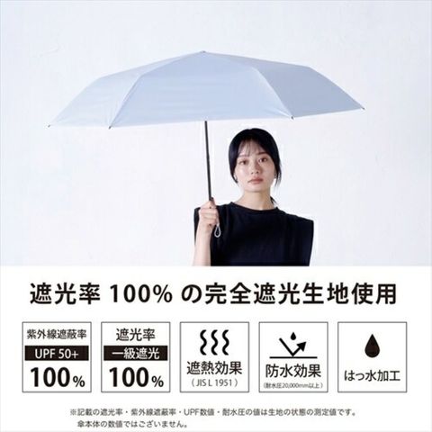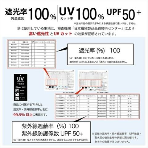 記載の紫外線遮蔽(UVカット)率・UPF値・遮光率・耐水圧値は生地の状態での測定値であり、傘本体の性能を保証する数値ではございません。