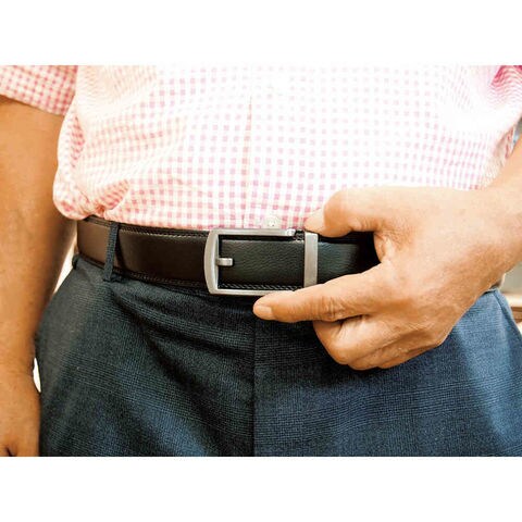 ●ベルト穴がなくてもお好みの位置で留まるラチェット式。食事後などお腹が苦しい時は、バックルを少し持ち上げてずらすだけで誰にも気づかれずにこっそりサイズ調整が可能です。